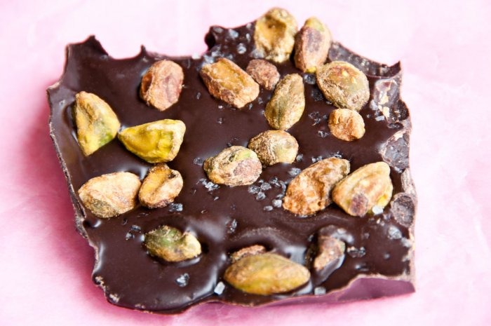 Chocoholics agree: this sweet and salty treat will satisfy any chocolate craving. Melt two tablespoons of semi-sweet chocolate chips and then pour the melted chocolate onto waxed paper. Chop up three pistachios and sprinkle them on top of the melted chocolate along with a few crystals of coarse salt. Then, pop the chocolate into the refrigerator for a few minutes until it hardens.