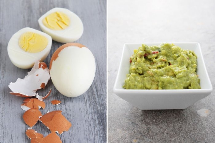 This rich, creamy snack is loaded with protein and good fat to keep you full. Start by hard-boiling two eggs. Peel and halve the eggs and discard the yolks (or save them for another purpose), and fill the hollowed-out egg white halves with a combined quarter cup of guacamole for a snack that will keep your healthy eating goals on track.