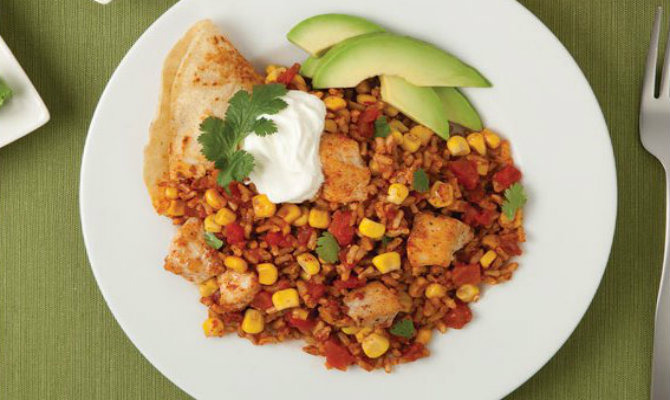 This quick chicken recipe is a take on chicken and rice with a few additions, like chopped tomatoes, chipotle chiles, corn, and cumin.
