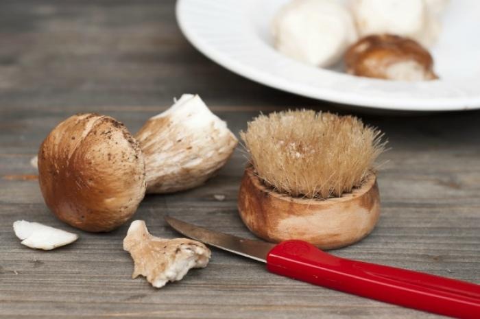 No water is needed to clean mushrooms — a dry brush is sufficient to sweep away dirt and microbes. If you have a particularly dirty mushroom, you can use a damp paper towel or give it a quick rinse under cold running water, but be careful not to get the mushroom too wet; mushrooms act like sponges and won't cook well if they absorb too much water.