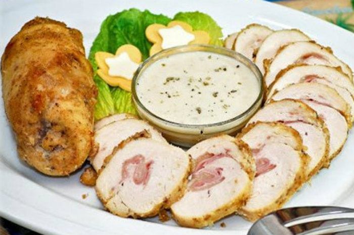 Chicken cordon bleu is a French-inspired poultry dish that was developed by chefs in the United States in an effort to imitate stuffed meat dishes from Europe. Cordon bleu, which means "blue ribbon" in French, has chicken, such as Gruyère or Swiss, and prosciutto or ham as the basic ingredients.