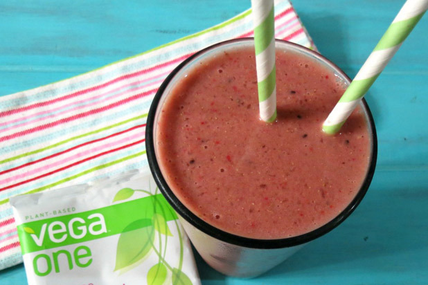 Peanut Butter & Peppers named her blog after her favorite foods, has lost 30 pounds over the past few years, and has set her new goal and trying not to count calories. She strives for a healthy and balanced diet, with indulgences in moderation. In her blog, she'll share recipes for all of her success and her flops, so you don't make the same mistakes. In this post, Peanut Butter & Peppers blends together frozen strawberries, fresh kiwi, water, and a Vega One Shake in Berry to make a nutritional and dairy-free shake.