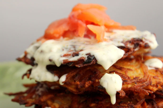 The Hungry Goddess, food for the ravenous soul, is a blog by Kimberly Moore, a "foodie, cook, food writer, and recipe creator," who is always hungry, and always sharing. In this post, she sweetens up potato pancakes by adding shredded parsnip and tops them with smoked salmon and dill sauce.