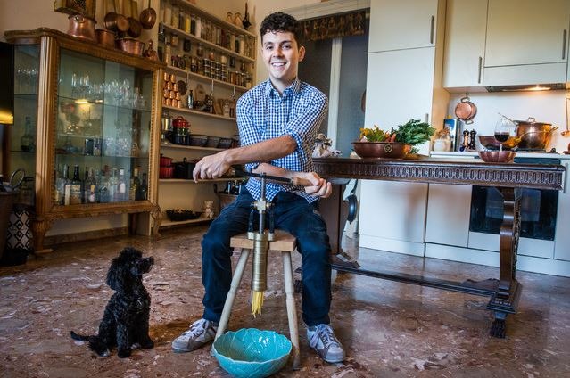 His kitchen: It's an old house and the kitchen and combined living room is the biggest room in the flat. Lots of copper pans and pots hang all over the walls, and there's a huge glass chandelier over the table. From the kitchen, you access a small balcony with a little statue on it facing the garden. I also use the kitchen for cooking lessons, showing foodie students of all ages how to make traditional food from the Veneto region, in the northeast of Italy. My favorite tool is the bigolaro (a stool with a grinder attached for making bigoli pasta.)