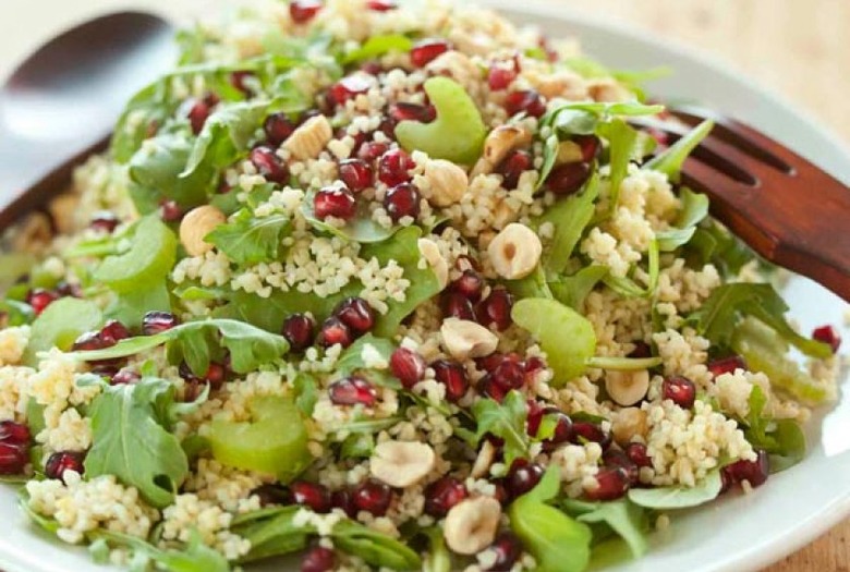Click through for this hearty Bulgar with Arugula, Pomegranate, and Hazelnuts recipe.