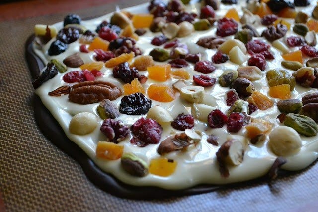 The View From Great Island used apricots, golden raisins, cherries, pineapple, cranberries, pistachios, macadamias, pecans, almonds, red walnuts, hazelnuts, and cashews in her fruitcake-inspired chocolate bark. Check out here recipe here.