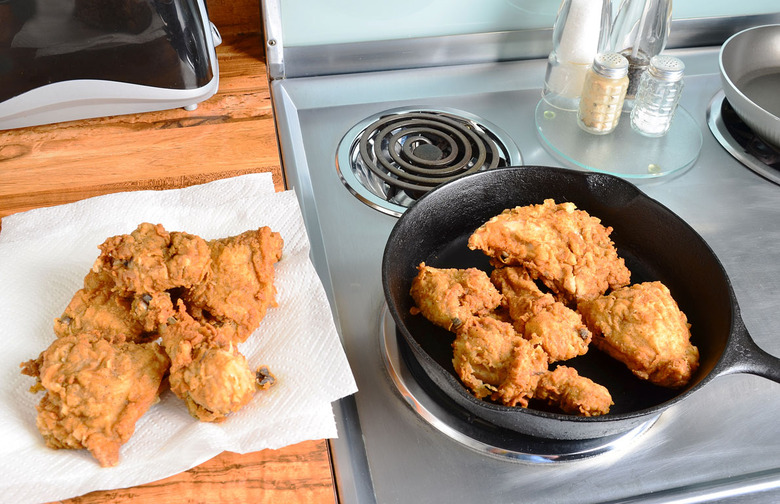 If you want to place freshly fried food on a paper towel for a few minutes to absorb some of the oil, that's fine, but don't leave it there; the paper towel will trap steam and cause your food to get soggy. A better option is to put fried foods on a wire rack set over a baking sheet. That way, the grease can drip off and steam can escape.