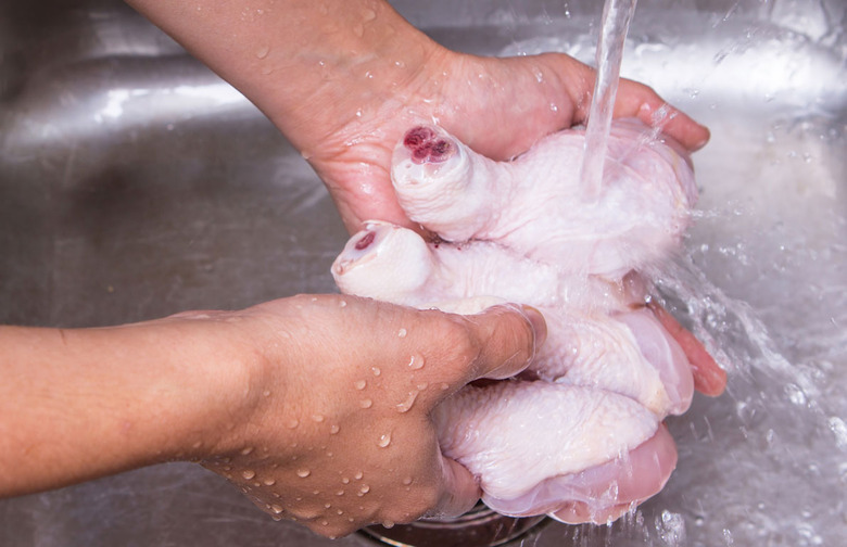Although raw chicken can carry bacteria, it's not a good idea to rinse it under running water. Not only can this spread germs around your kitchen (even if you're careful, bacteria can splash onto surfaces around the sink), but cooking chicken to the correct internal temperature will kill any bacteria that may be present.