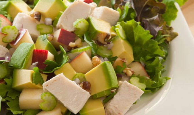 This delicious avocado salad is loaded with texture: crunchy red apples, celery, and toasted pecans stand out among the buttery greens, herbs, and avocado. Dress the salad with a simple mix of salt, lemon juice, and olive oil for a meal that's as delicious as it is good for you.