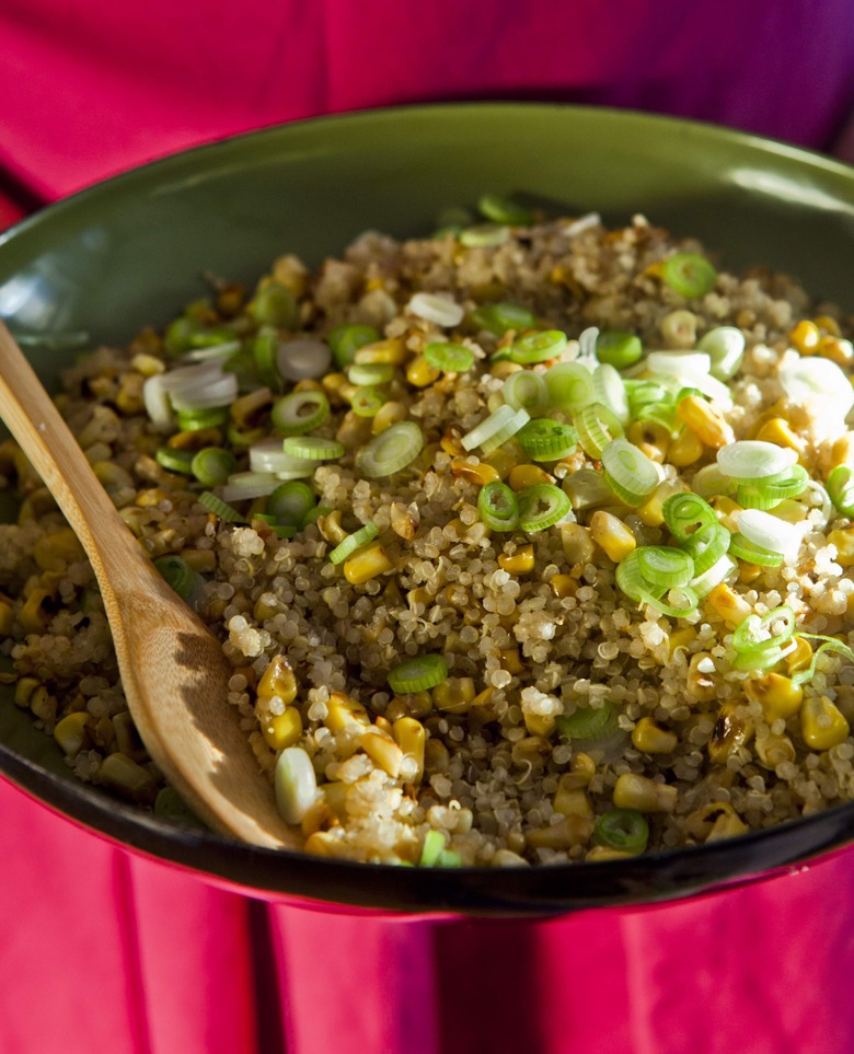 Obviously, I like all of the recipes in the book, which is why they're there, but one that I find myself talking about all the time is the corn rice, which is rice cooked in stock that is made by boiling shucked corn cobs. I got the corn stock idea when I did an internship at Chez Panisse, where we used the stock to make a puréed corn soup. I love that this recipe literally leeches every bit of flavor from the corn cobs. And the resulting rice tastes like sweet corn even before you toss in the sweet corn. I tried making it with supermarket corn (because even I get tired of hearing myself say you have to start with good ingredients), but it didn't work. The rice tasted like a vague memory of corn, and it certainly wasn't worth the time of boiling the cobs. You have to buy the corn at a farmers market, which, in my opinion, is a pretty nice way to spend an hour on a summer (that's corn season) day, so there could be worse prescriptions, plus the whole idea behind the rice was to take advantage of sweet summer corn while it lasted, which pretty much boils down everything I think about cooking right there in a pot of rice. Or quinoa, as the case may be.