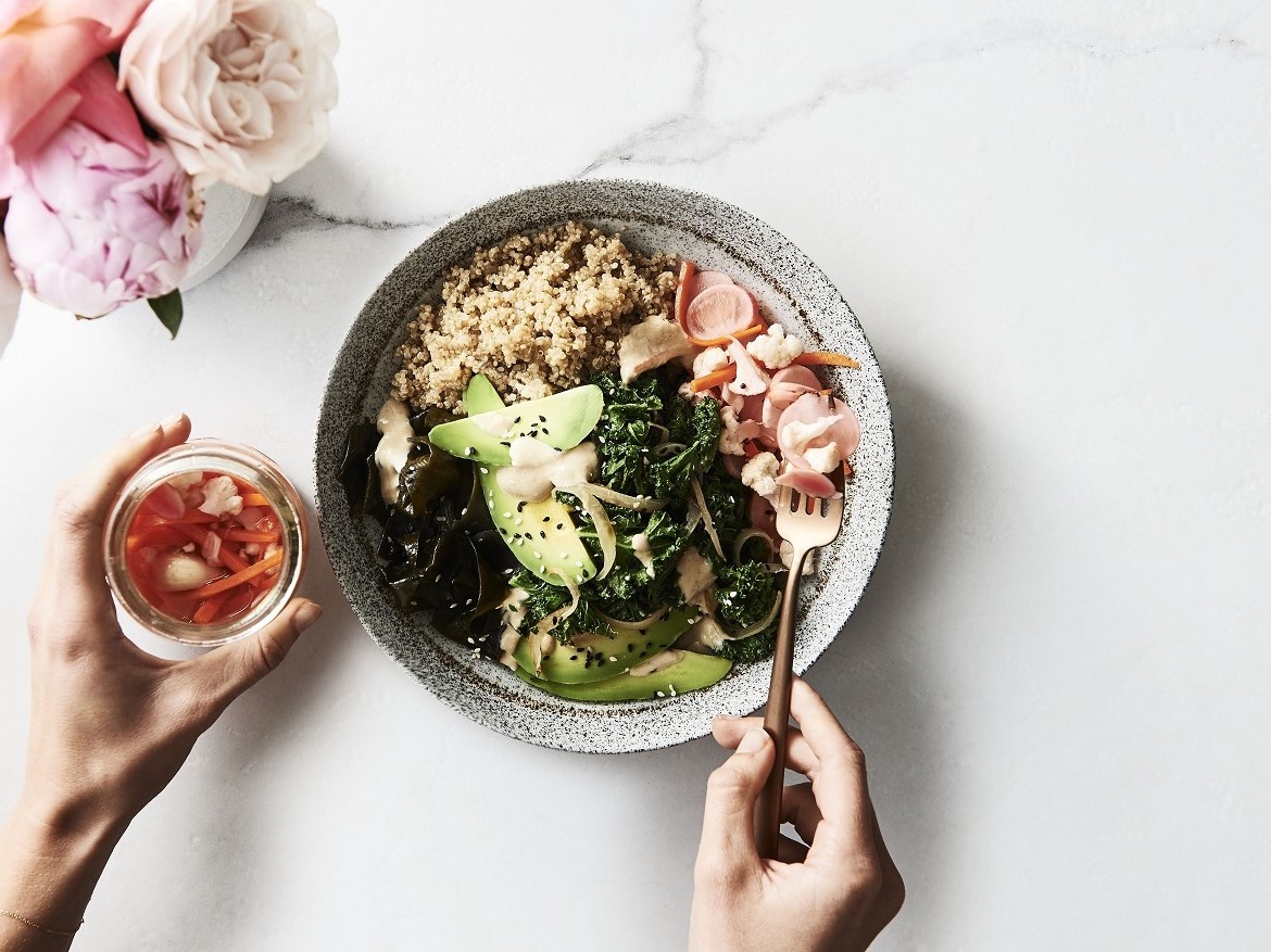 — Kale Bowl With Quinoa, Fermented Vegetables, Wakame, and Avocado