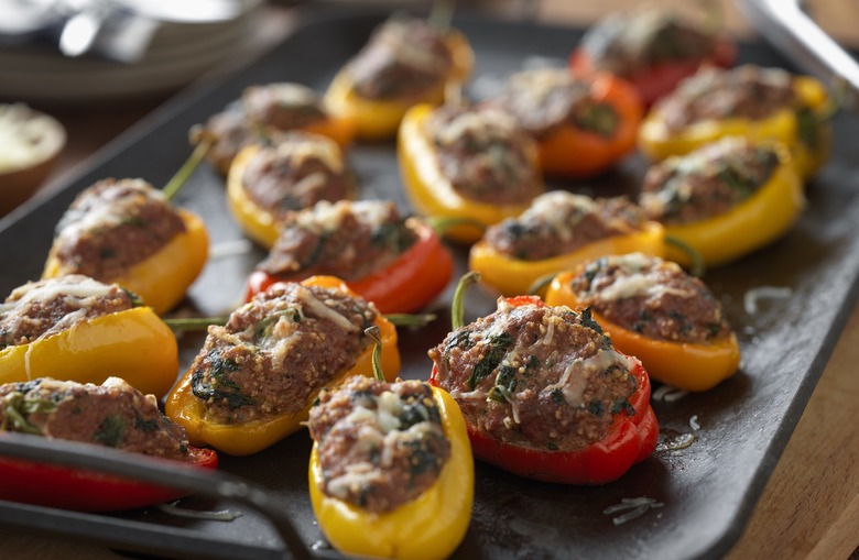 Bake the dish for about 30 minutes. Use a meat thermometer, a kitchen tool every home cook should have, to ensure that the ground beef is safe to eat. Serve the mini stuffed peppers alongside more of our iconic game day snack recipes.
