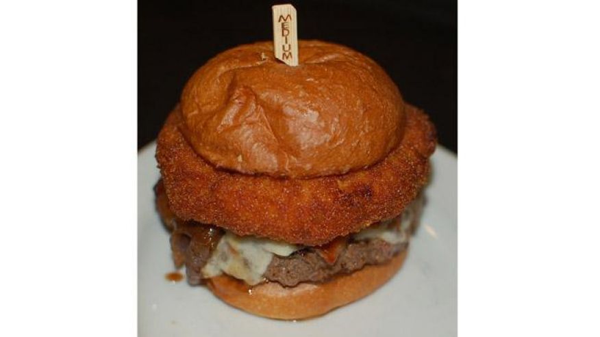 A plain old hamburger is kicked up a few notches with the addition of a miso dressing, soy ginger mushrooms, and a tempura onion ring.