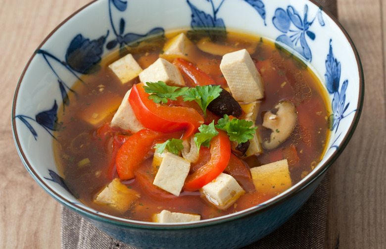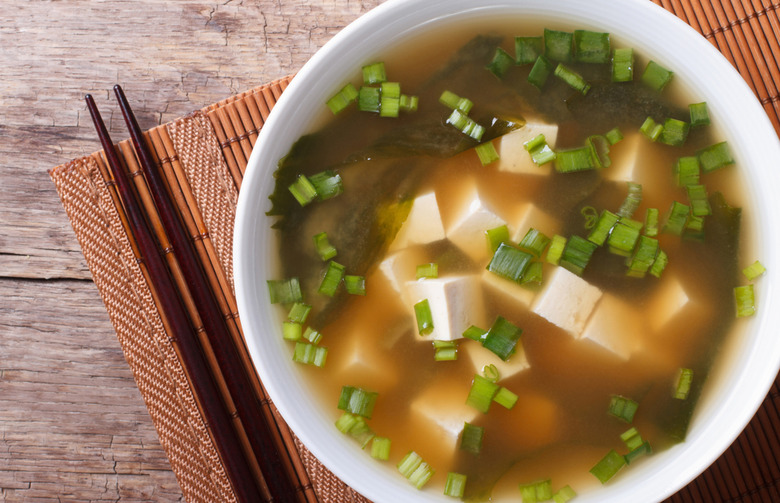 When it comes to creating a rich and balanced soup, the trick to keep in mind is always make sure you're developing layers of flavor. This starts with the broth and should be carried through to the garnishes. This miso soup begins with a simple kombu-based dashi (Japanese broth), then various flavors are added (soy sauce, ginger, sriracha sauce, rice wine vinegar, and sake), followed by white miso, the main ingredients (tofu, shiitake mushrooms, kale, and sautéed scallions), and finally topped with a sprinkle of diced fresh scallions. — Molly Aronica