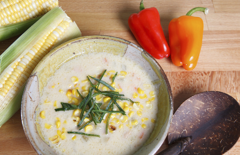 Creamy corn chowder with a Southwestern kick! Corn and Hatch chiles are simmered in a silky cumin scented broth for a filling soup that is both soothing and spicy. — Marye Audet