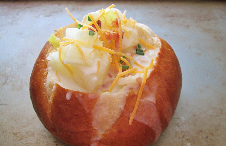 Inspired by the Leaky Cauldron, one of Harry Potter's frequent Diagon Alley haunts, this hearty take on classic leek soup warms me right down to my soul. The bacon, potatoes, and leeks all come together to make the ultimate comfort food, but the bun bowls are what really set this dish apart. Since rolls and soup are featured so often as sides, mini bread bowls seemed like the perfect way to marry two sides together. Of course, you can use any kind of bread you want. I chose pretzel bread because it's hearty and resembles cauldrons (pumpernickel is great too!). Just be sure the variety you choose has a hard outer crust (to prevent the soup from soaking through). Bon appétit! — Alison's Wonderland Recipes