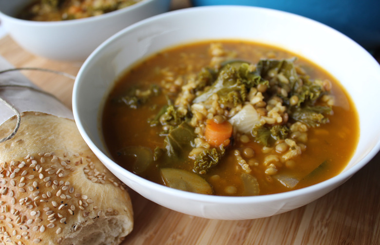 The heartiness provided by the kale and lentils brings "comfort" right into this soup and packs in a great amount of energy. I think most of the spices and amounts of garlic can be modified to suit your own tastes, which is why this soup can be so versatile. You could even add chicken stock if you just can't go without and I think it would turn out great! — Megan Watson
