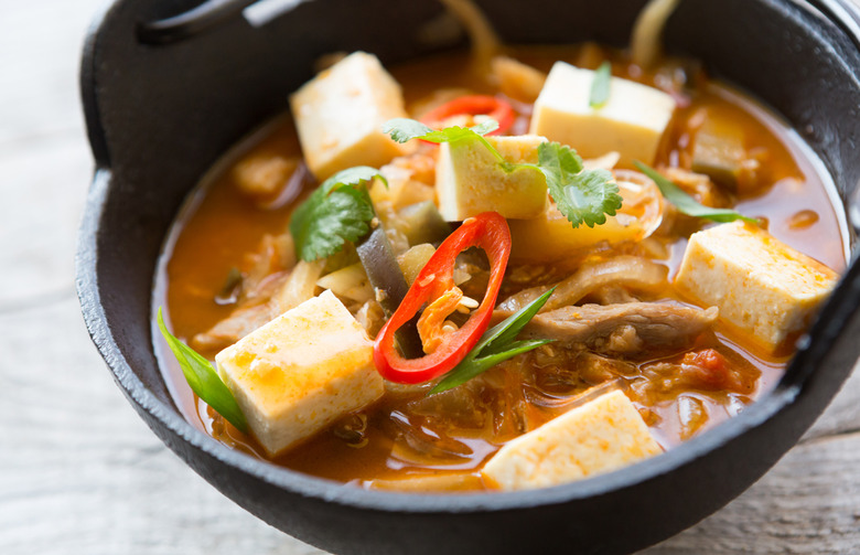 I love soft silken tofu, and this spicy soup is surprisingly addictive. The mushroom stock gives this stew, or jjigae, a deep earthy taste and complexity. The sweet zucchini and the creamy egg cut the spiciness as well. This is one of my favorite jiggaes and it is so good for you; perfect for a cold winter's evening. — Judy Joo