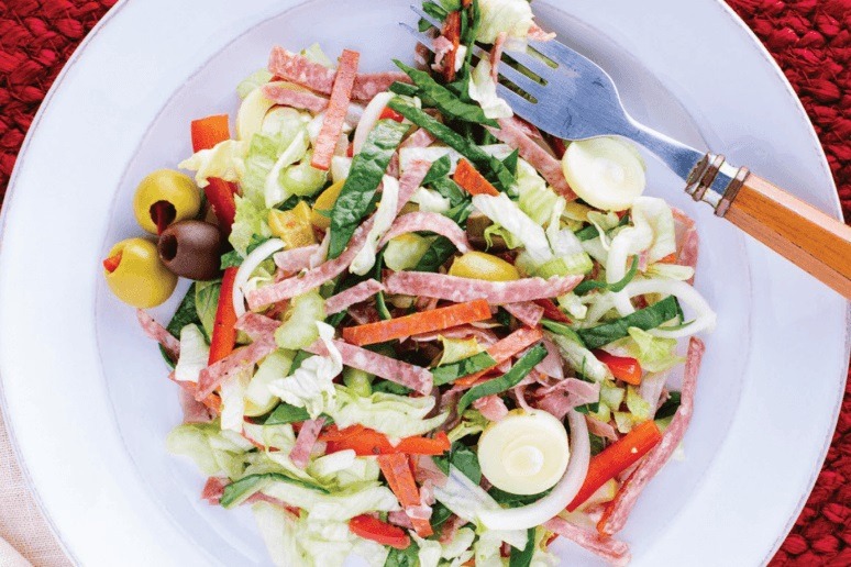 This salad has all of the flavors of a classic Pennsylvanian hoagie, with minimal effort. Simply chopping up the right ingredients will give you this hearty salad, full of Italian cold cuts and crunchy iceberg lettuce.