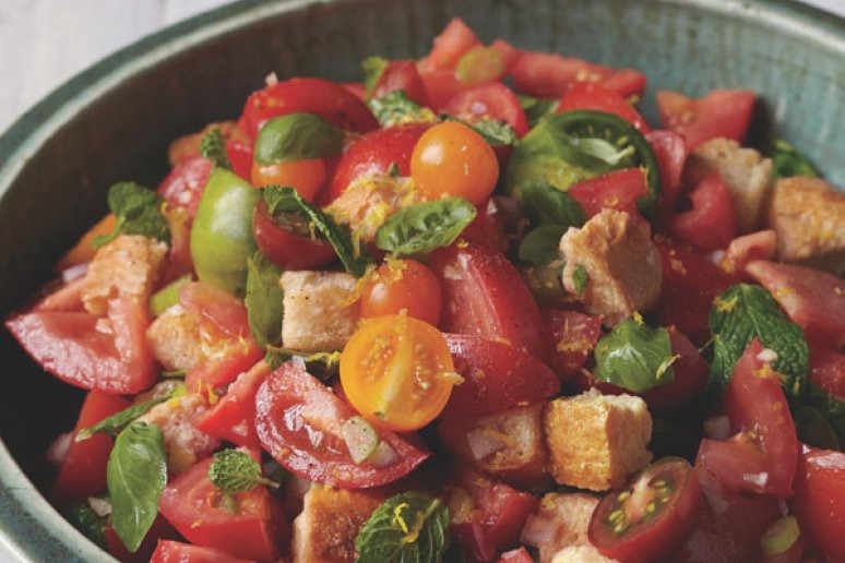 Panzanella is a classic Tuscan salad that uses stale bread, juicy tomatoes, lemon zest, and mint. This combination of flavors and textures makes for a very satisfying bite. This recipe is the perfect way to use up any stale bread you have — there's no need to even turn on the oven to make croutons!