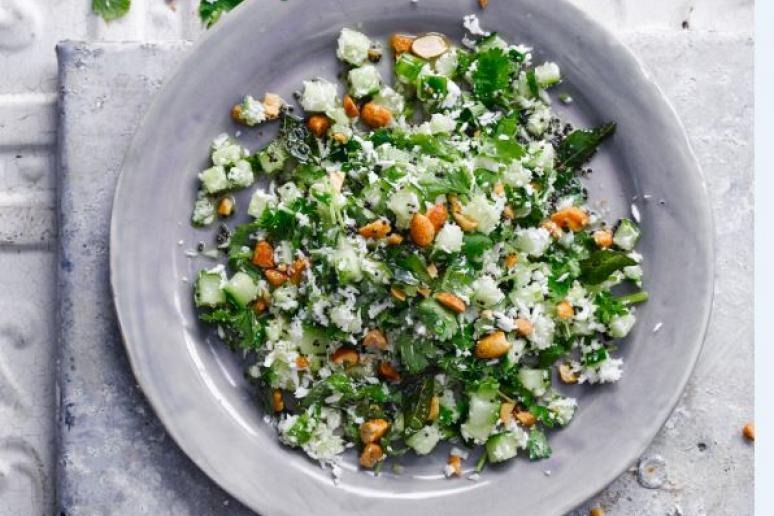 This vegan salad is simply dressed with olive oil and lemon juice, with extra flavors coming from cilantro, red onion, and tomatoes. Raw cauliflower adds heartiness, and one clove of raw garlic adds some spiciness. If you want to make it creamier, add a tablespoon or two of tahini to the dressing, or (if you aren't vegan) some cooling yogurt to complement the garlic.
