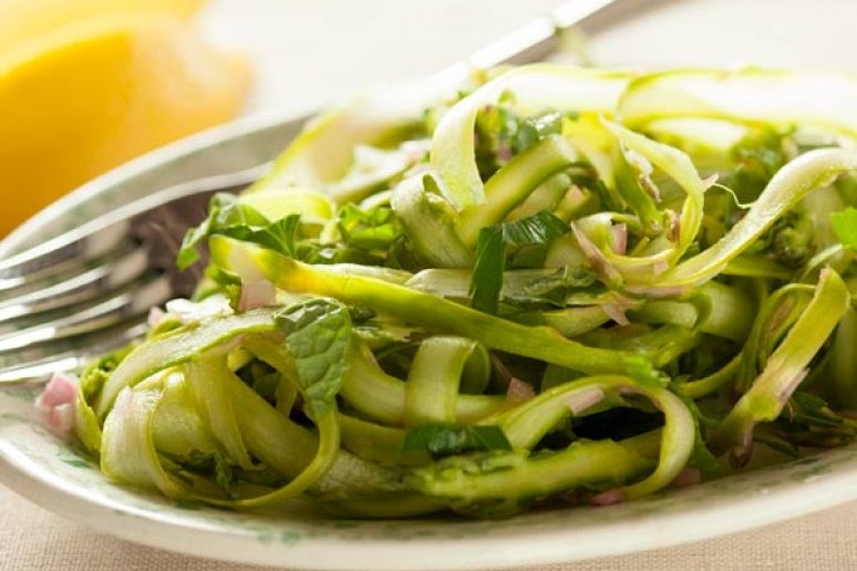 Shaved asparagus is fresh and light and benefits from the light marinade of Dijon mustard, honey, and lemon juice. The final garnish of fresh mint and parsley rounds out the flavor.