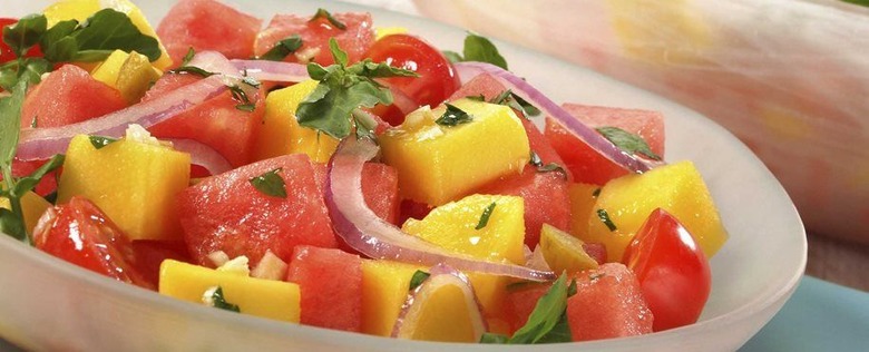 Cubes of watermelon, thinly sliced red onion, cherry tomatoes, watercress, and mango make for a salad that is sweet, savory, and refreshing. This elegant appetizer can be served before the meal or alongside a well-seasoned protein.