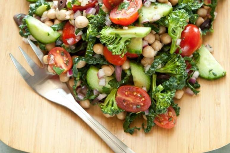 This quick and easy salad delivers great Mediterranean flavor using ingredients like cooked chickpeas, Kalamata olives, fresh herbs, and red wine vinegar.