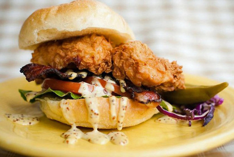 Coated in buttermilk and fried until crisp, Southern-style fried chicken is the perfect partner in crime for bacon. A tangy spread of Dijon mustard–mayonnaise keeps the richness of each bite in check and complements the flavors in the sandwich nicely. — Brian Sonoskus