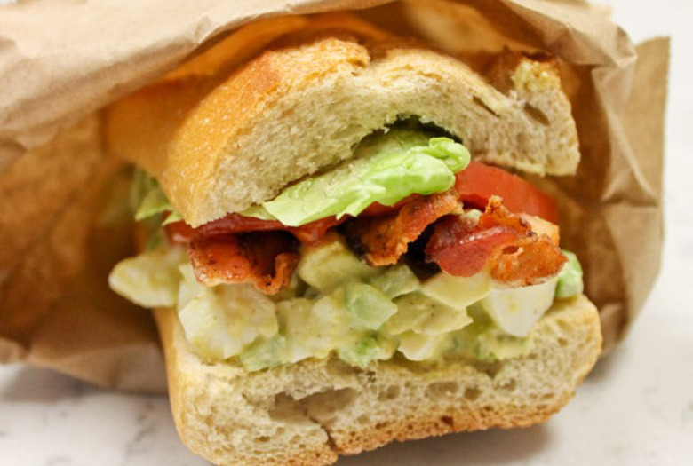 I love egg salad, and while I usually like to enjoy it all on its own, this time I served it as an additional component to a classic BLT sandwich. I layered bacon, lettuce, and tomato on a baguette with my basic egg salad recipe, but I added one surprise: avocado. — Anne Dolce
