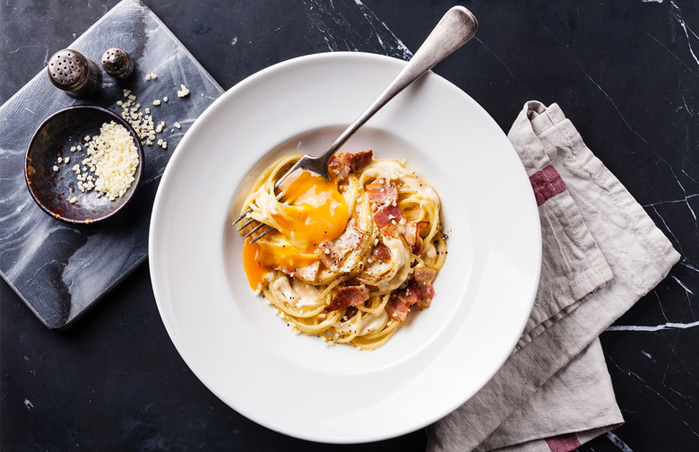 Here's a great pasta dish that is full of all your favorite breakfast flavors but still feels a bit like dinner — for anyone who might be feeling a bit suspicious of breakfast for dinner! Creamy egg, smoky bacon, and Parmesan cheese — who could resist!