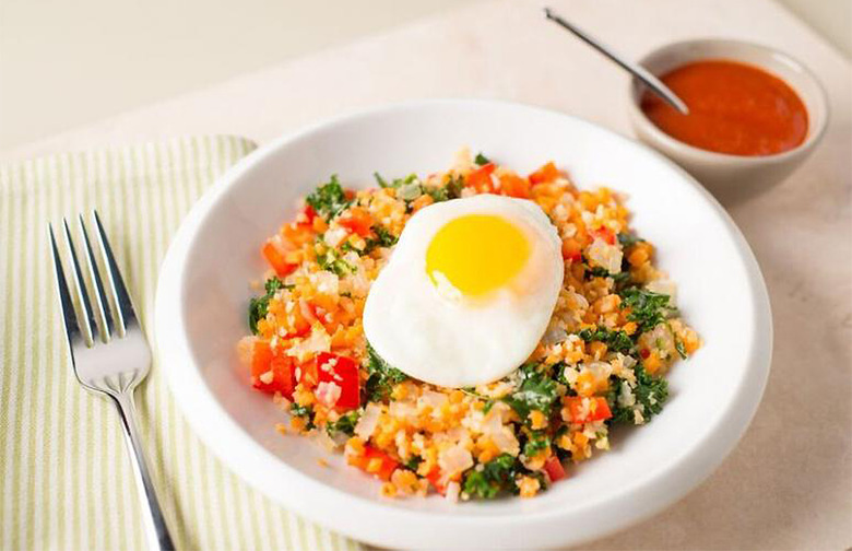 You can still be healthy and enjoy all the comforts of breakfast for dinner with this cauliflower and sweet potato hash that is topped with an egg in the style of your choice.