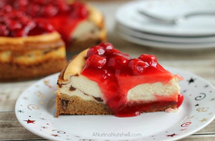 Cherry Topped Cheesecake with Triple Chocolate Chunk Cookie Crust