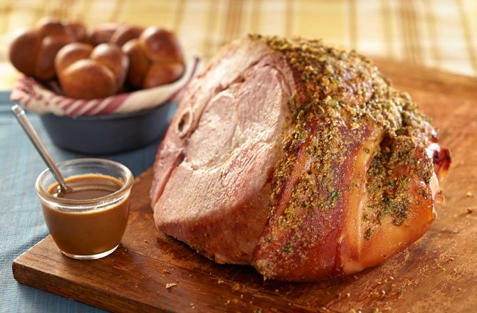Don't get scared off because it sounds healthy. This simple baked ham gets a protein-packed punch from a wheat germ crunch. Serve with a tangy apple cider-Dijon mustard sauce. Click here to see the recipe.
