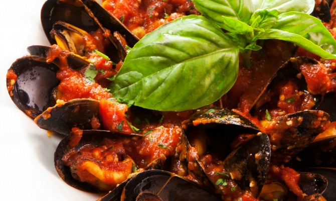 Mussels Marinara. Steamed mussels tossed in rich tomato sauce are the perfect antidote to spring showers. Add a pile of steaming linguine for a full meal.