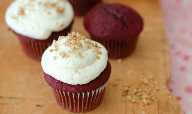 Red Velvet Cupcakes. Topped with a simple cream cheese butter cream frosting, these bright and cheery cupcakes are a great rainy day project for the whole family.