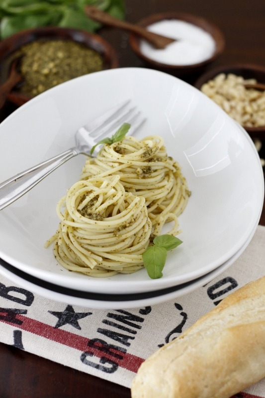 A little bit of basil pesto goes a long way when making the sauce for this spaghetti.