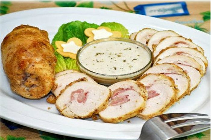 Chicken cordon bleu is a French-inspired poultry dish that was developed by chefs in the United States in an effort to imitate stuffed meat dishes from Europe. Cordon bleu, which means "blue ribbon" in French, has chicken, such as Gruyère or Swiss, and prosciutto or ham as the basic ingredients.