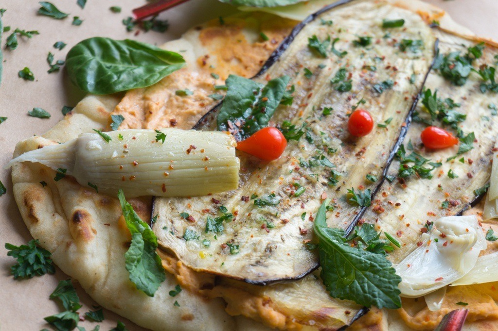 Eggplant, hummus, greens, marinated artichokes, and chopped parsley fill soft flatbread in this dish by Oat and Sesame.