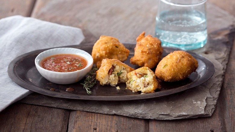 Hopefully your candidate's poll numbers don't dip as much as you'll be dipping these fritters into the homemade bacon pepper sauce. Similar to hush puppies, a classic Southern dish, this appetizer gets its rich flavor from whole kernels of hominy and thyme.