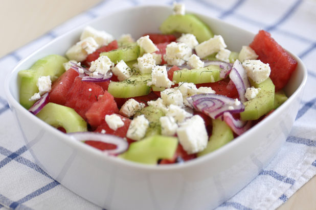 Watermelon and cucumber have high water content, which helps hydrate the skin. They're also both cooling foods, which will help bring your body temperature down.