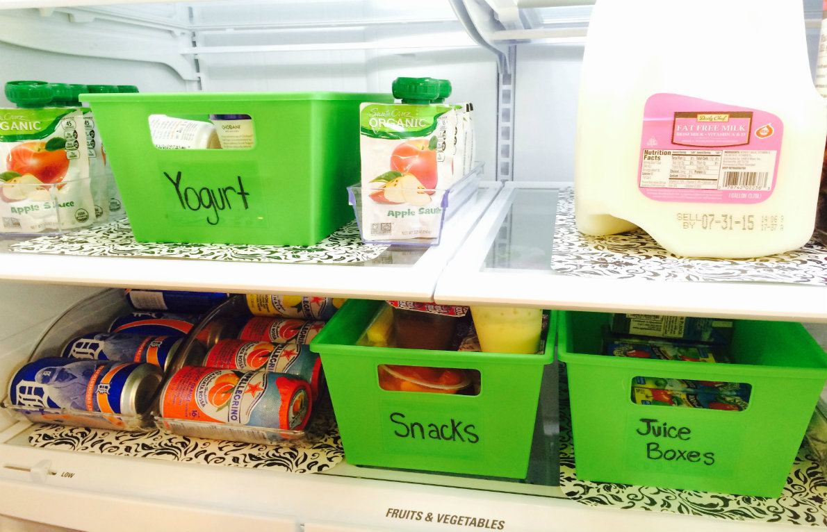 Remember all the yogurt, juice boxes, and snacks I mentioned? By placing these in labeled green bins, I cut the clutter and made these food items easier to find. Once you clean out your refrigerator, you will notice a theme of certain foods that you have in larger quantities. This is where the labeled bins will really come in handy.