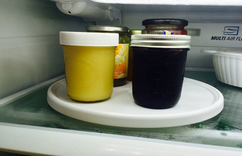 Here's a favorite tip of mine: use a lazy Susan inside the fridge to gather all your jam, jellies, and peanut butters. Like the placemats, it's easy to remove and wash when it gets too sticky.