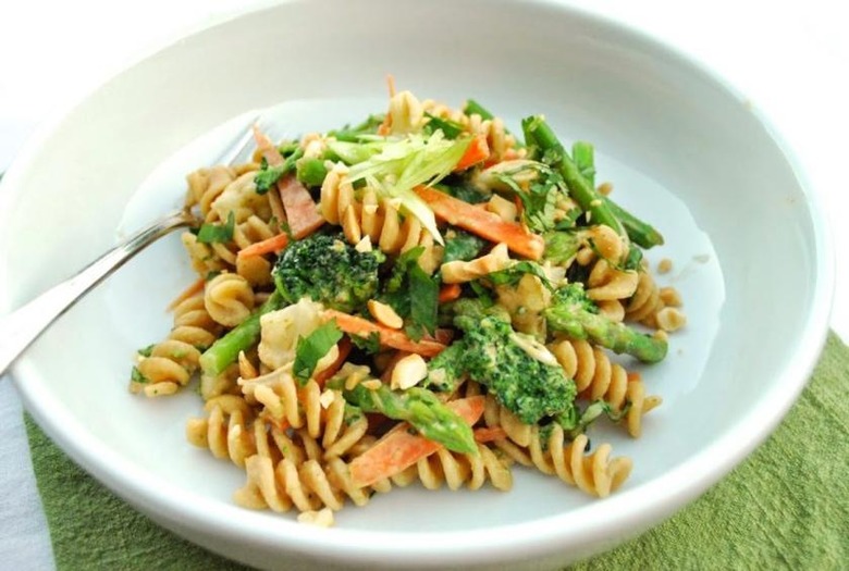 No summer cookout would be complete without a pasta salad. This version mixes chopped broccoli, cauliflower, and carrots with whole wheat pasta, and a dash of peanut butter adds flavor while increasing the protein content.