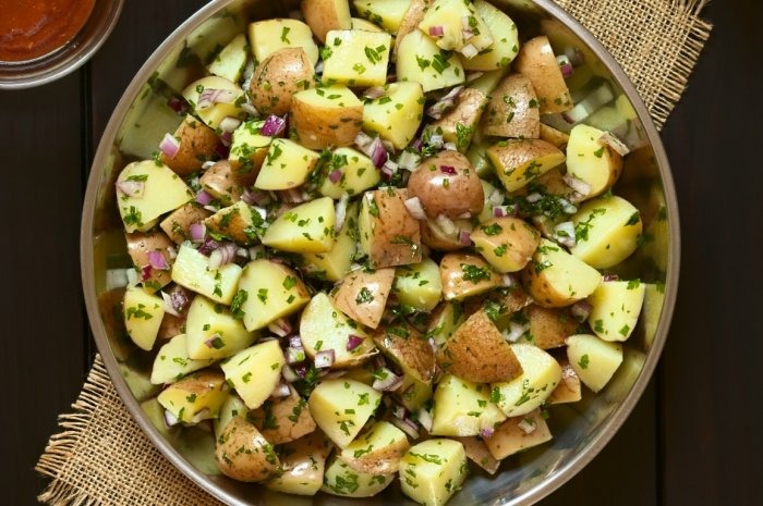 With just a handful of ingredients, you can create a potato salad that's not only delicious and memorable, but also healthier since we swapped the heavy mayonnaise for a tangy vinaigrette. This recipe uses waxy red-skinned potatoes instead of starchy potatoes, so there's more fiber to help you feel satisfied with less.
