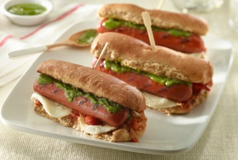 Our Healthiest and Unhealthiest Store-Bought Hot Dogs article dubbed Applegate Farms the healthiest option out there for both all beef dogs and turkey dogs. Applegate's 100% beef dog is made with organic, grass-fed beef too! For an exclusively low-cal beef option Oscar Mayer Extra Lean Franks was the winner for the best low fat option. Turkey dogs are also a good choice and are the primary ingredient in this featured recipe Mozzarella Pesto Turkey Franks. Click here for the recipe!