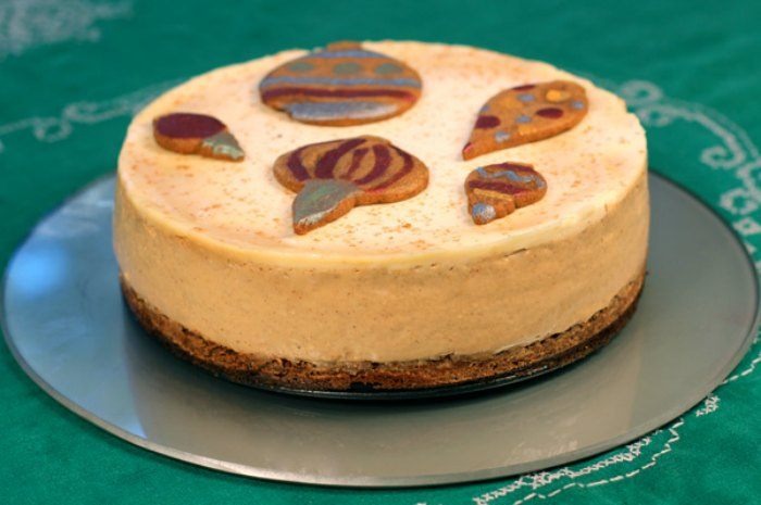 Use store-bought gingerbread cookie dough as the base to this cheesecake; cut out festive shapes with any leftover dough and use them as decorations. Click here to see the recipe.