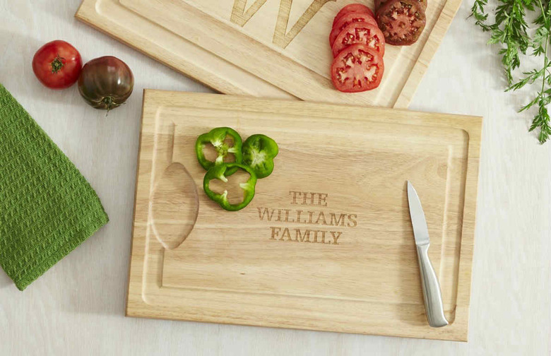 This rubberwood cutting board makes a wonderful gift for any cook. It can be personalized with a single initial or up to a three-line message. And, because of the natural variations in the wood and the custom design, this sturdy cutting board can easily double as a stylish serving tray.