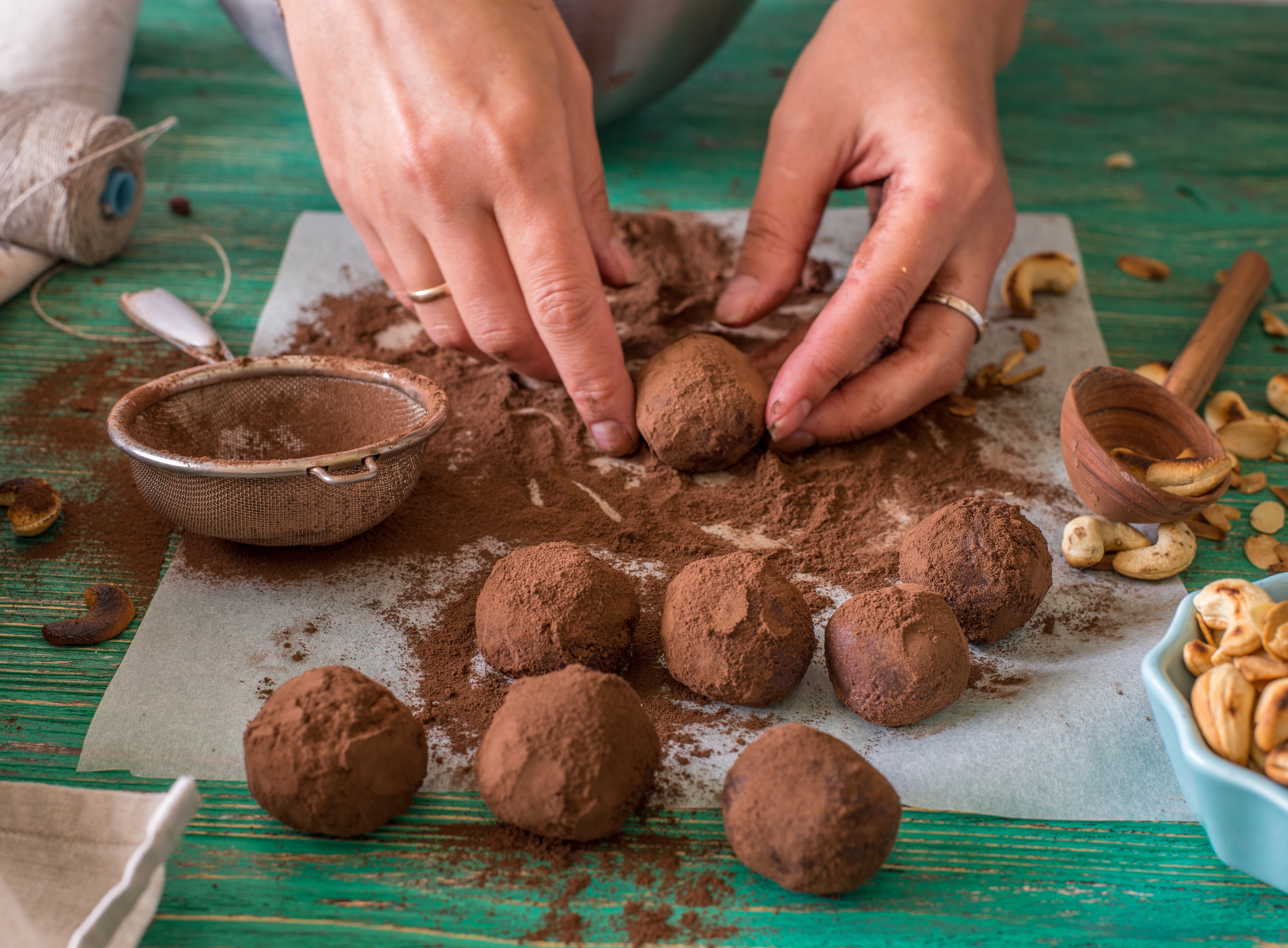 When the ganache is firm, scoop out a small amount, roll it into a ball, and then roll the ball of ganache into cocoa powder, chopped nuts, shredded coconut, or sprinkles.