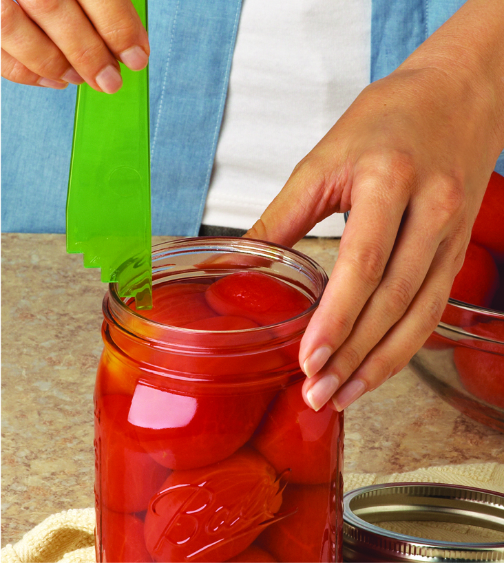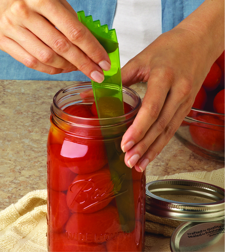 - Remove one hot jar from hot water, using a jar lifter, empty water inside jar. Fill the jar with prepared recipe using a jar funnel, leaving headspace recommended in the recipe. Remove air bubbles by sliding a non-metallic spatula down the side of the jar & press inwards. Repeat around the jar.